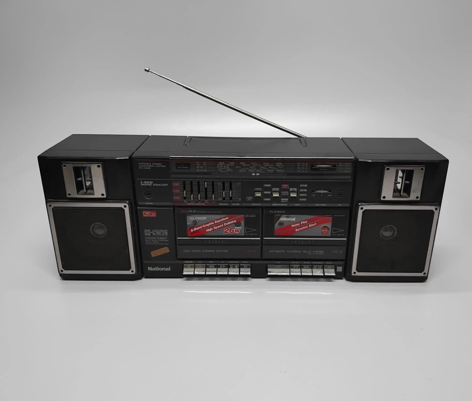 📼🎶 National RX-CW25 Vintage Boombox (1980s Original) – Dual cassette deck with high-speed dubbing, 5-band EQ for custom sound, 26W power output, AM/FM/SW/LW tuner, mains + battery support. 🕰️ Rare collectors’ item for retro music lovers in Sri Lanka 🇱🇰.